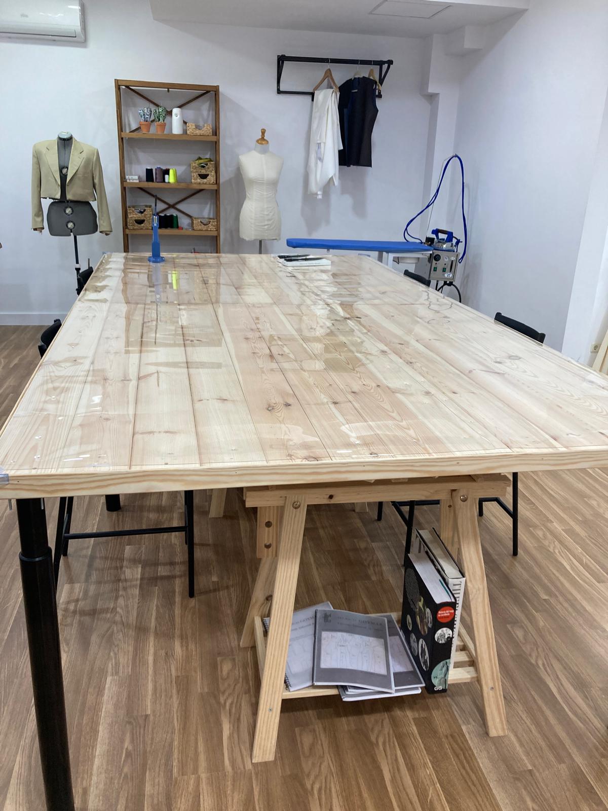 Mesa de corte de madera maciza: El lienzo de tus proyectos. Contamos con una amplia y robusta mesa de madera, el espacio perfecto para extender patrones, medir y cortar telas grandes con total comodidad. Aquí, cada centímetro es importante y cada corte se realiza con confianza y facilidad.